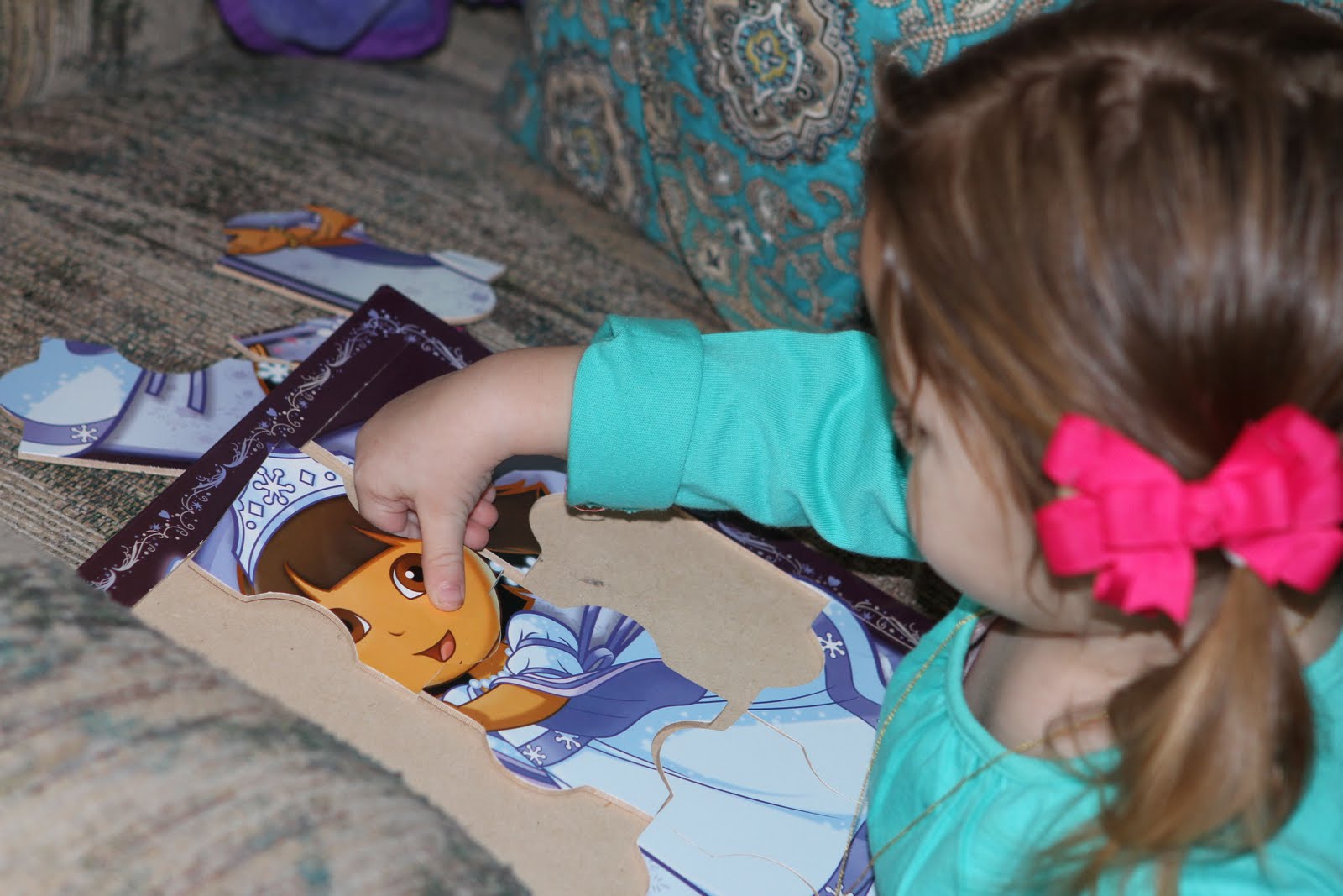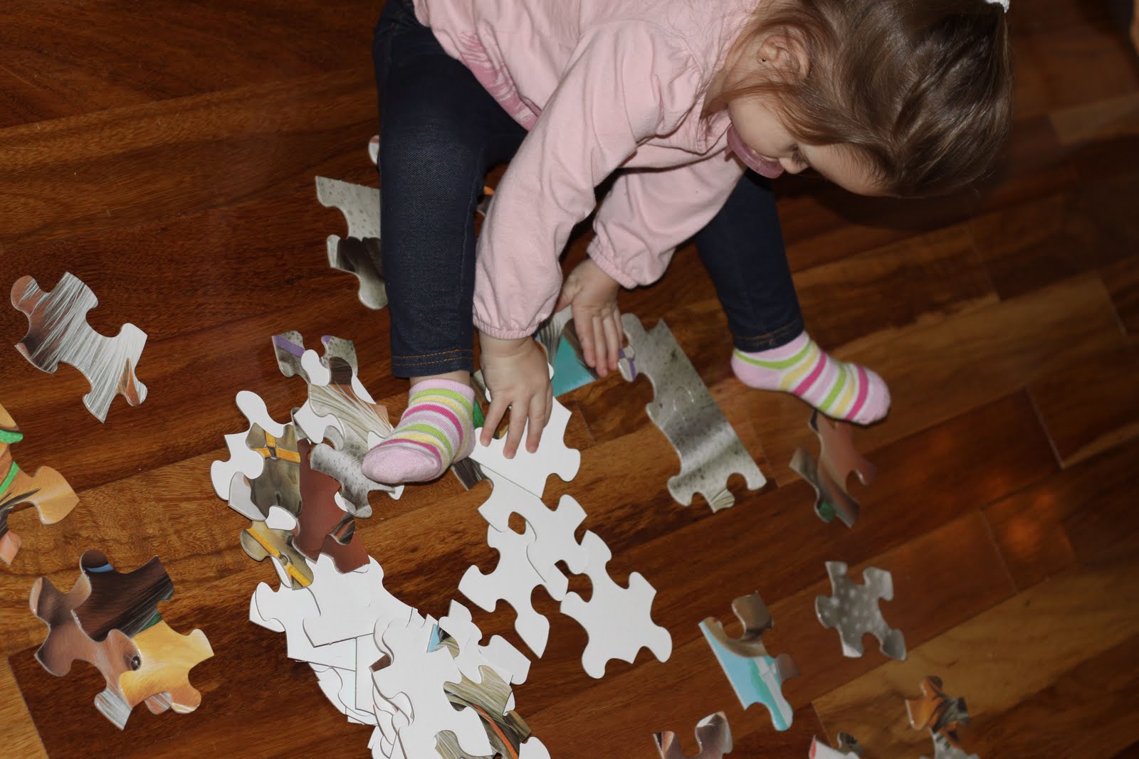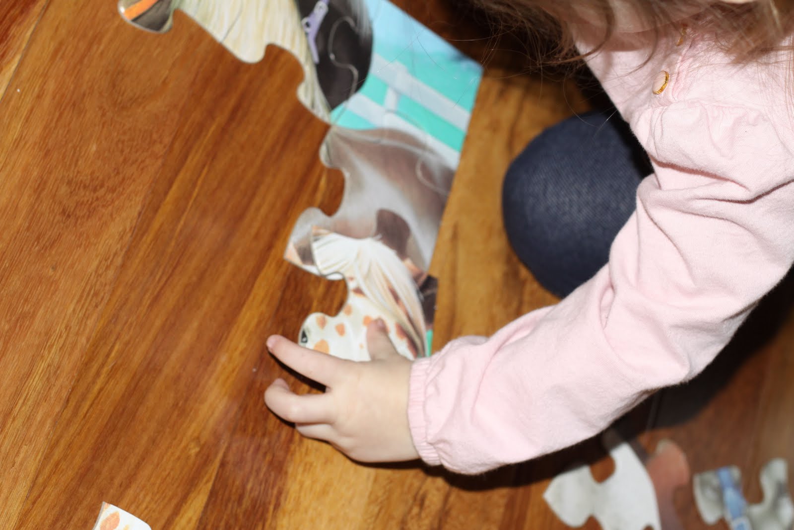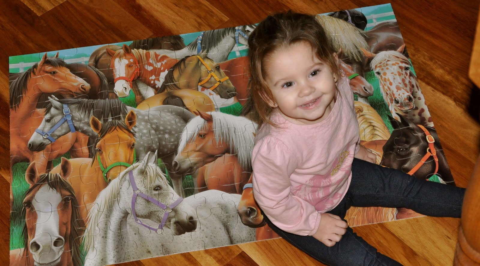 and has from a very early age. It’s amazing to Poppy and I when we watch how she can figure out where the pieces go so quickly. I remembered either Chase or Cierra having a big, 96 piece horse puzzle. So….I dug it out of the closet and let her have some fun –