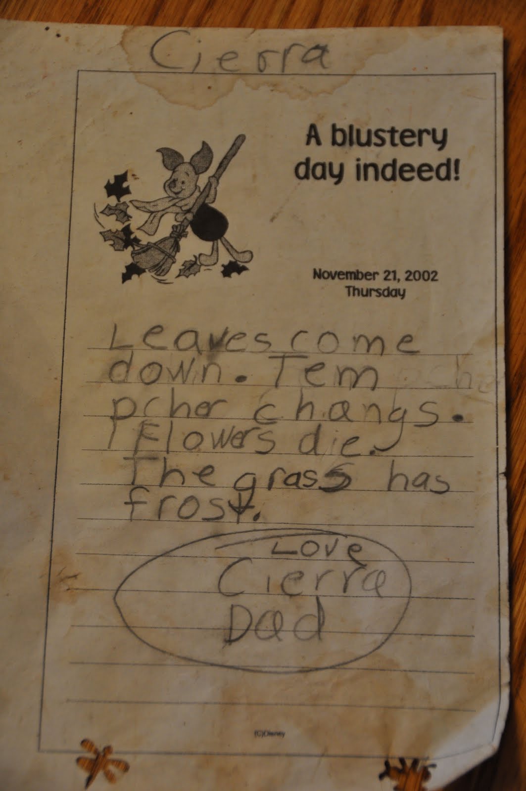 Ronnie loved it back then and it’s still something that he carries with him. When he was cleaning out his ‘work’ van a few weeks ago he stumbled upon it. How fitting….the leaves come down, temperature changes, flowers die and the grass has frost. All with Piglet raking up the leaves. Somethings always stay the same =)