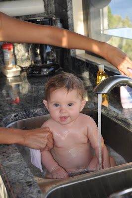 Kayden had her first bath in a sink! The house has three bathrooms but no tubs, only showers. She didn’t seem to mind.