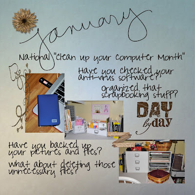 Today was a dreary, dreary day. We didn’t even go to church (although I am almost caught up with my daily reading of “God Sightings”). All five, yes I said five kids slept in, we had a late breakfast then off to work Ronnie and I went cleaning up piles, files, e:mails, etc. How fitting that I discover during my mission that January is “National Clean Up Your Computer” month?! Wow, I actually can say I met the challenge. I cleaned out all my e:mails, filing and deleting as necessary, downloaded some overdue digital scrapbook elements and sorted through actual ‘paper’ piles. The only thing I have left is to figure out the best way to sort and file my downloaded scrapbook elements and papers. I have looked around at a couple sites but can’t seem to find anything that I follow or can figure out. If anyone out there has any ideas, PLEASE let me know!