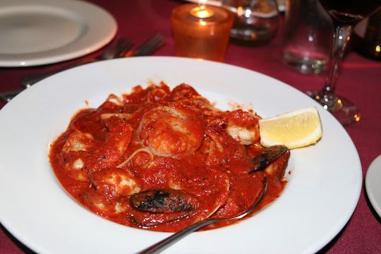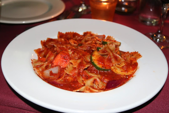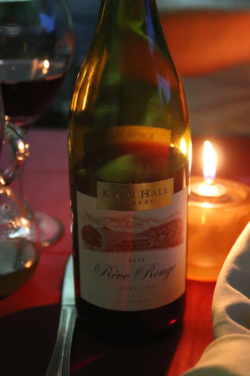 We had already decided we wouldn’t buy any wine because we just can’t bring ourselves to pay a lot of money for a bottle of CA wine when we know the value you get with the local MD and VA wines. But…..interestingly enough, Knob Hall Reve’ Rouge was on the wine list! YAY us! AND it was half price wine night……SCORE =)