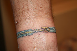 During our first visit to St. John, we purchased ‘the Carribbean Hook Braclet’ which has different meanings based on the position of the ‘hook’. If the hook is facing towards you, you are taken; hook facing outward means you are available (for the record, Ronnie’s is facing toward him lol). Ronnie isn’t a fan of jewelry however he loved this ‘fish hook’ bracelet. So..he decided to have it tattooed on his arm. He can still wear his actual bracelet because if he chooses to he can wear his watch (a gift from me for our 10th anniversary) and it covers his left wrist. Another creative tattoo…