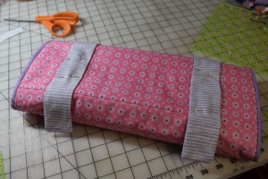 I thought it would be perfect to put some little pieces in for one of the granddaughter’s presents which meant pink, purple. Ahhhh. I read the instructions. I cut the material.