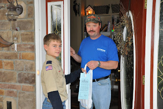 For those of you that are local, this is the picture you would have seen on the front page of the Spirit of Jefferson and also in the Martinsburg Journal. Today you just might see this little boy picking up the food you are leaving on your porch in support of the annual Boy/Cub Scout Food Drive. Our goal is 16,000 lbs this year so your support is definitely needed!