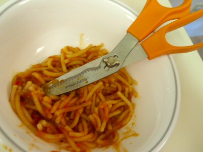 I have always cut my spaghetti. My husband even cuts his before the sauce goes on =)