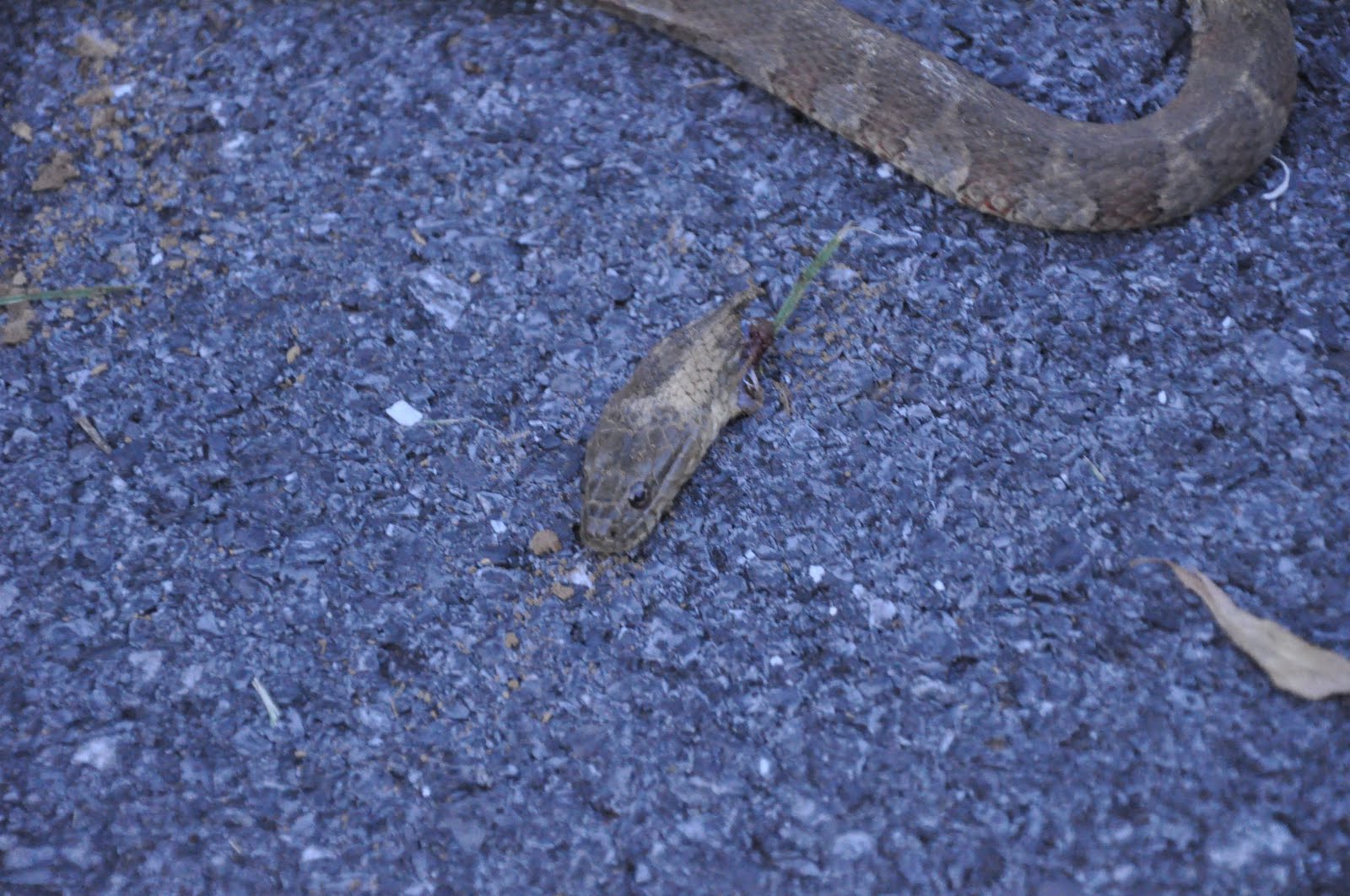 Ewwww..so we kept our eye on it until Ronnie could get over there. He immediately said “wow, I think that’s a copperhead”. He decided to scoop it onto a shovel and put it on the asphalt so we could get a better look. Nope, it tried to get away so quickly he ‘took care of it’.