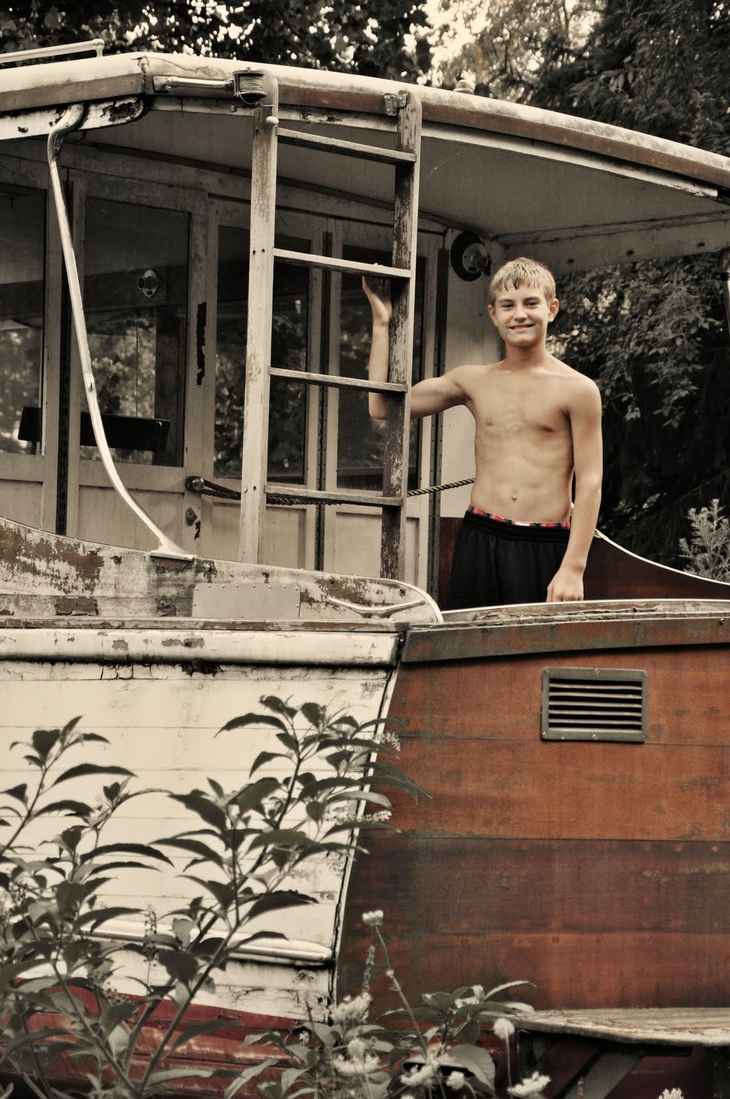Chase spent time most of his day today sleeping in, riding his bike and in the pool. Stretching has become a part of his daily routine (actually many times throughout the day). We did get adventurous this afternoon though and…went beyond the “caution” tape” for a mini photo shoot….(check out this boat!)