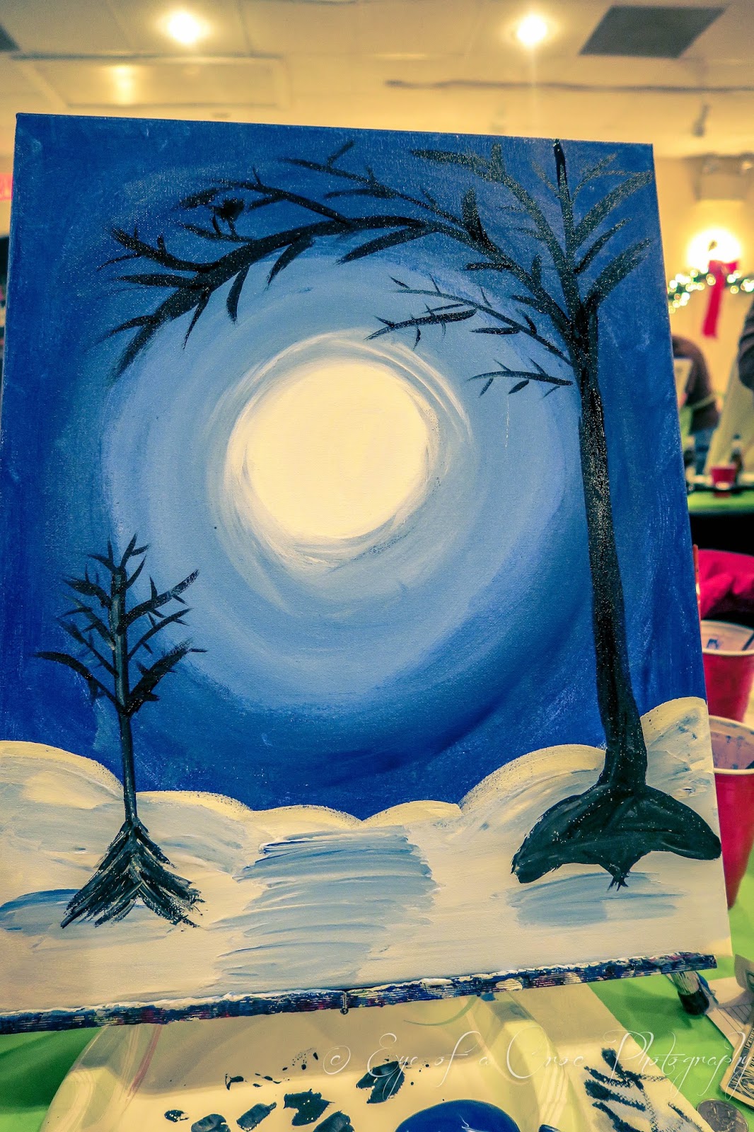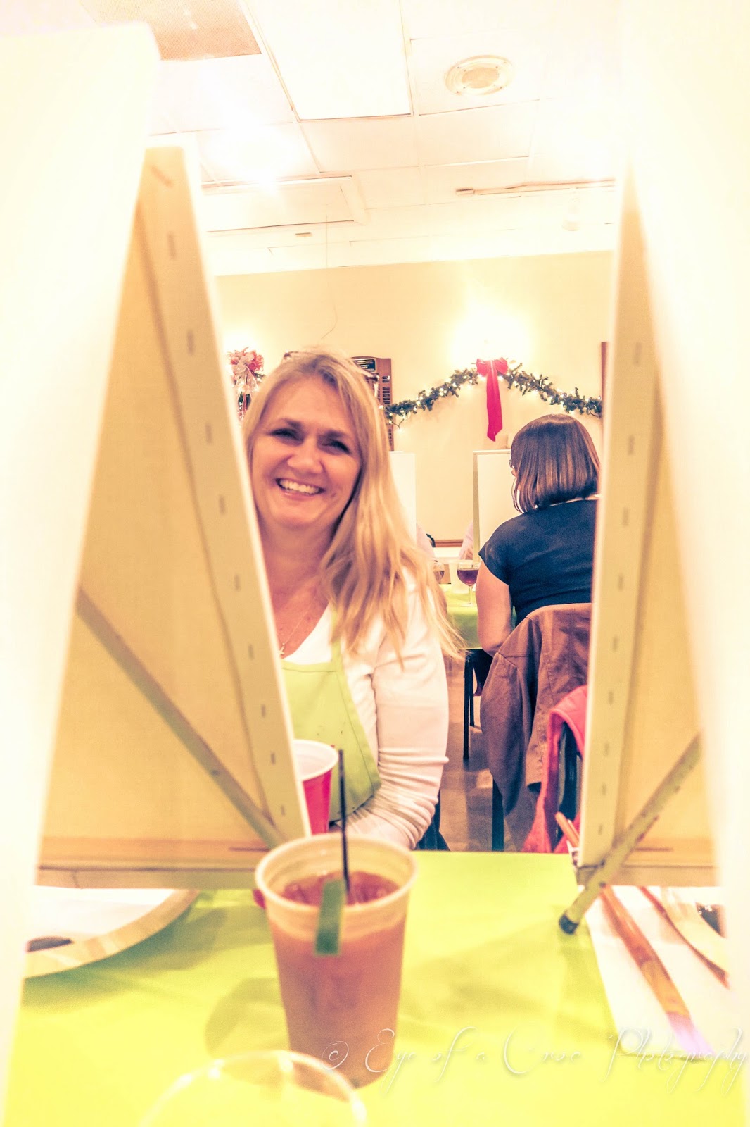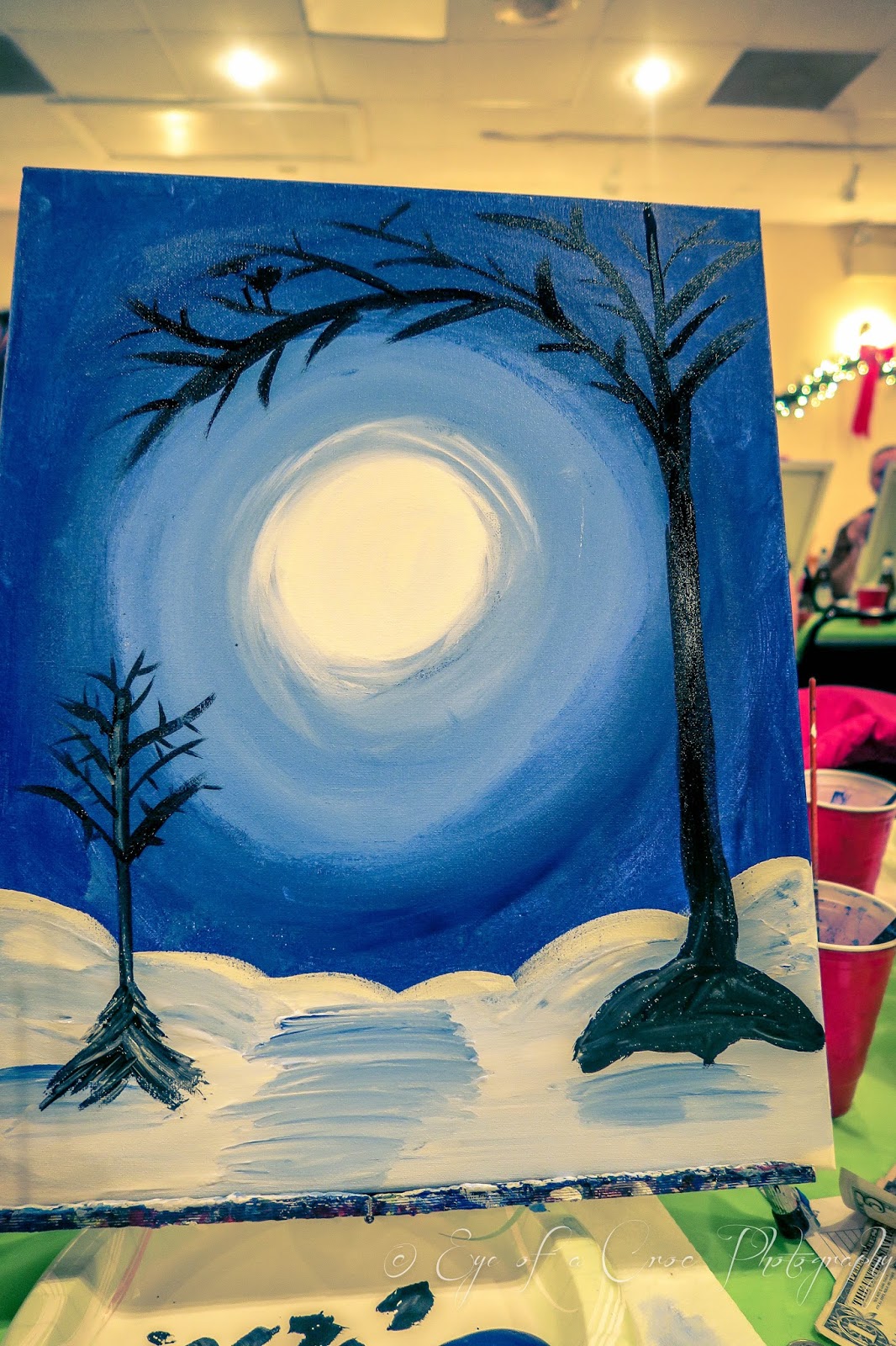 OK, as promised (at least to Nanny) I have to share Paint Nite. I will admit, I was a little skeptical. I am not artistic. I cannot paint. I don’t follow directions well. Add all that up and geez……disaster. But….NOPE. The ladies that entertained us for the evening knew just what to do. Here’s some pictures –