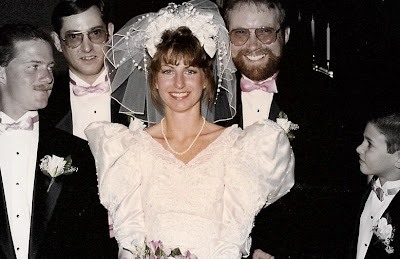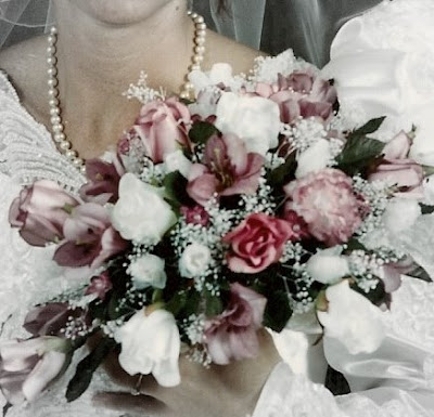 First, let me say that way back then country blue and mauve really were the colors. I still have this bouquet!