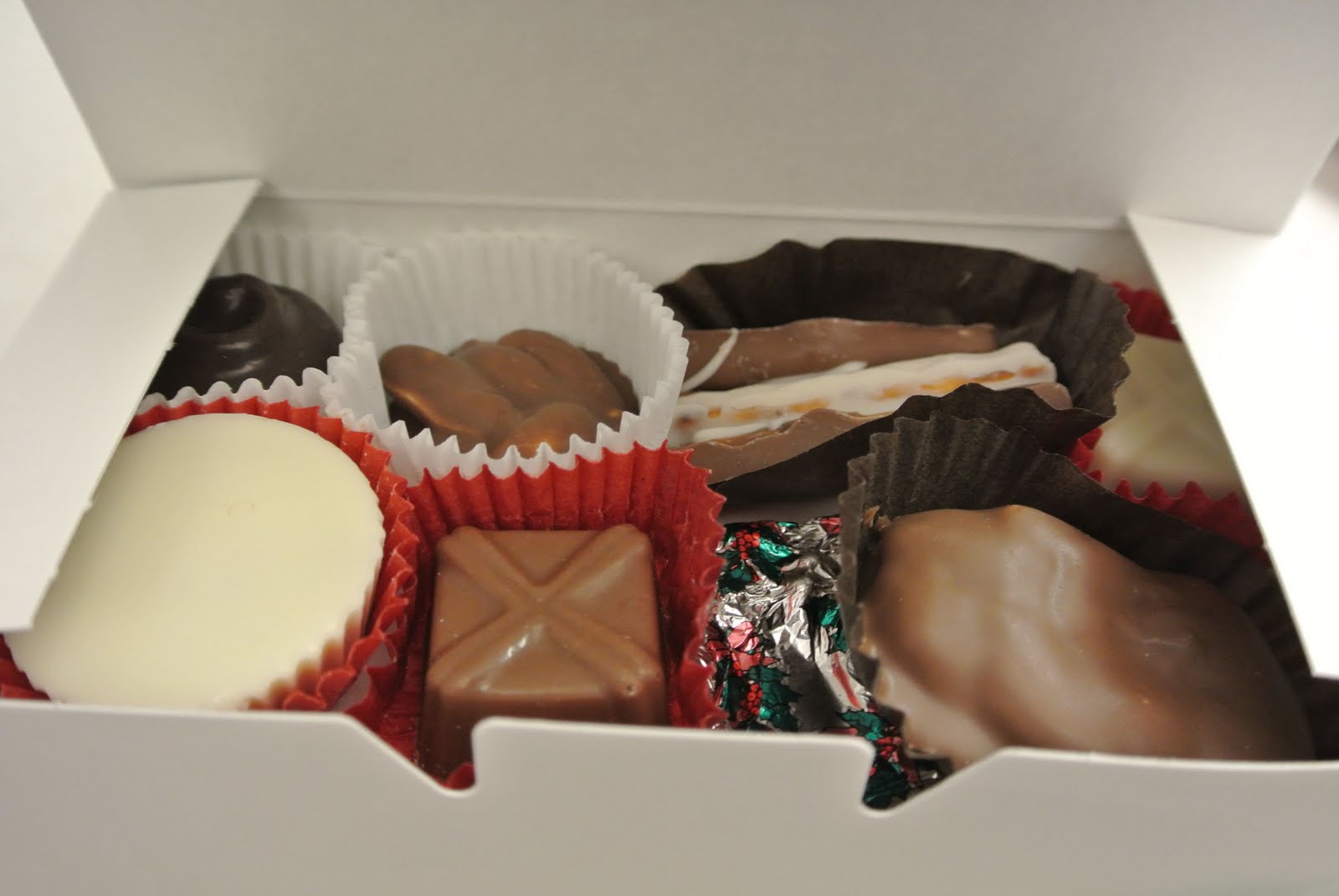 and I was totally sad surprised, happy, excited; tons of emotions went through my mind. You see for as many years as I can remember, the week of Christmas I always got a box. Just like this one. Full of delicious chocolates. Made just for me (and a few others). I was always so excited and was known to eat the whole box by myself; the same day I received, ha! And when I did, a few pieces would be snuck shared with me so I could take them home to Ronnie. So why would it be different this year? Well, because Greg left us 8 months ago. (has it really been 8 months?) And even after 8 months, the office still isn’t the same. But today, the Christmas candy memory became reality. At this time of year it has to be tough for Donna yet she somehow found a way to make us smile.