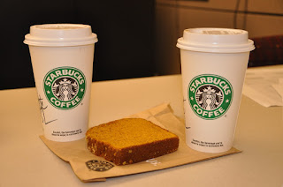 Pumpkin spice latte’ (one decaf, one fully leaded, both skim milk, whipped cream, extra hot) and Pumpkin bread for lunch! We shared a piece since we are both watching our girlish figures, LOL!